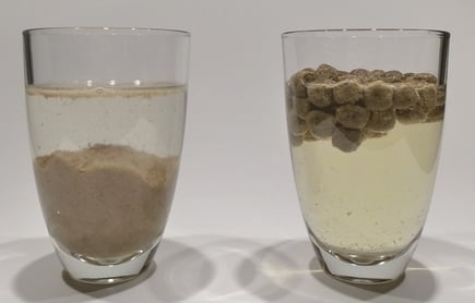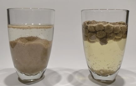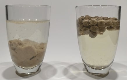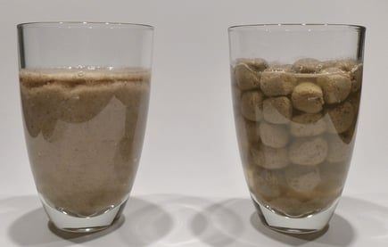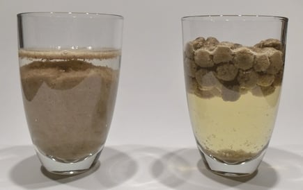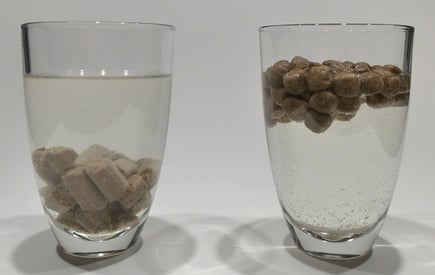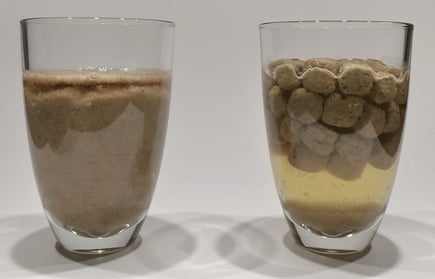 Der nachfolgende kleine Versuch zeigt deutlich, wie sich ein kaltgepresstes Trockenfutter im Vergleich zu einem extrudierten Trockenfutter verhält, wenn Flüssigkeit hinzugefügt wird.