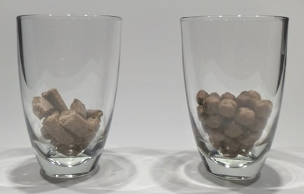 Je 40g kaltgepresstes (links) Trockenfutter und extrudiertes (rechts) Trockenfutter wurden in ein Glas mit identischem Fassungsvermögen gegeben.